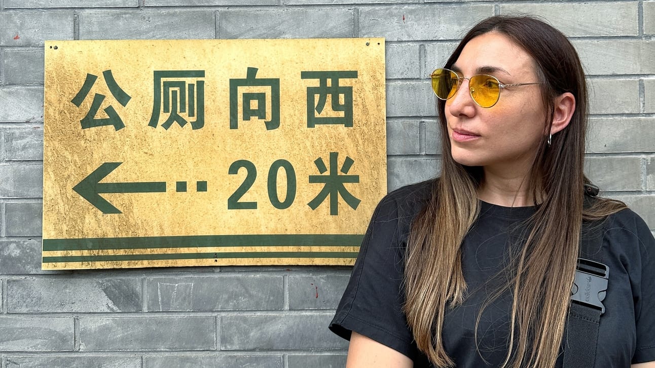 Posando junto a un cartel que indica que el baño público se encuentra 20m hacia el oeste